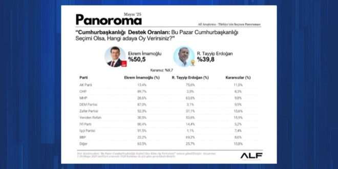 راپرسییەکە لەلایەن ناوەندی توێژینەوەی “ئاڵف” لە رۆژانی یەک بۆ 10ـی ئەم مانگە، لەگەڵ سێ هەزار و 920 کەسدا ئەنجامدراوە و بەگوێرەى ئەنجامەکان، 50.5%ـی ئەو کەسانەی بەشدارییان لە راپرسییەکەدا کردووە گوتوویانە، لە ئەگەری ئەنجامدانی هەڵبژاردنی سەرۆککۆمار لە تورکیا، دەنگ بە ئەکرەم ئیمامئۆغڵو، بەربژێریی جەهەپە دەدەن، کە زیاتر لە دوو مانگە لە پۆستی سەرۆکی شارەوانیی ئیستانبوڵ دوورخراوەتەوە و لە زینداندایە.