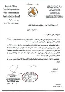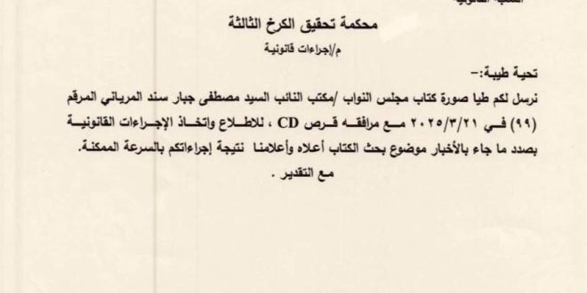 هەروەها هەر دوێکە دکتۆر محمد خەفاجی ئەندامی لیژنەی یاسای پەرلەمانی عێراق نووسراوی ئاراستەی داواکاری گشتی کردووە بۆ جوڵاندنی سکاڵا لە سەر هەمان دۆسییە، هەمان پەرلەمانتار داوای لە فوئاد حوسێن وەزیری دەرەوە کردووە رێوشوێن بگرێتەبەرو لە دادگای تایبەتمەند سکاڵا تۆماربکات.