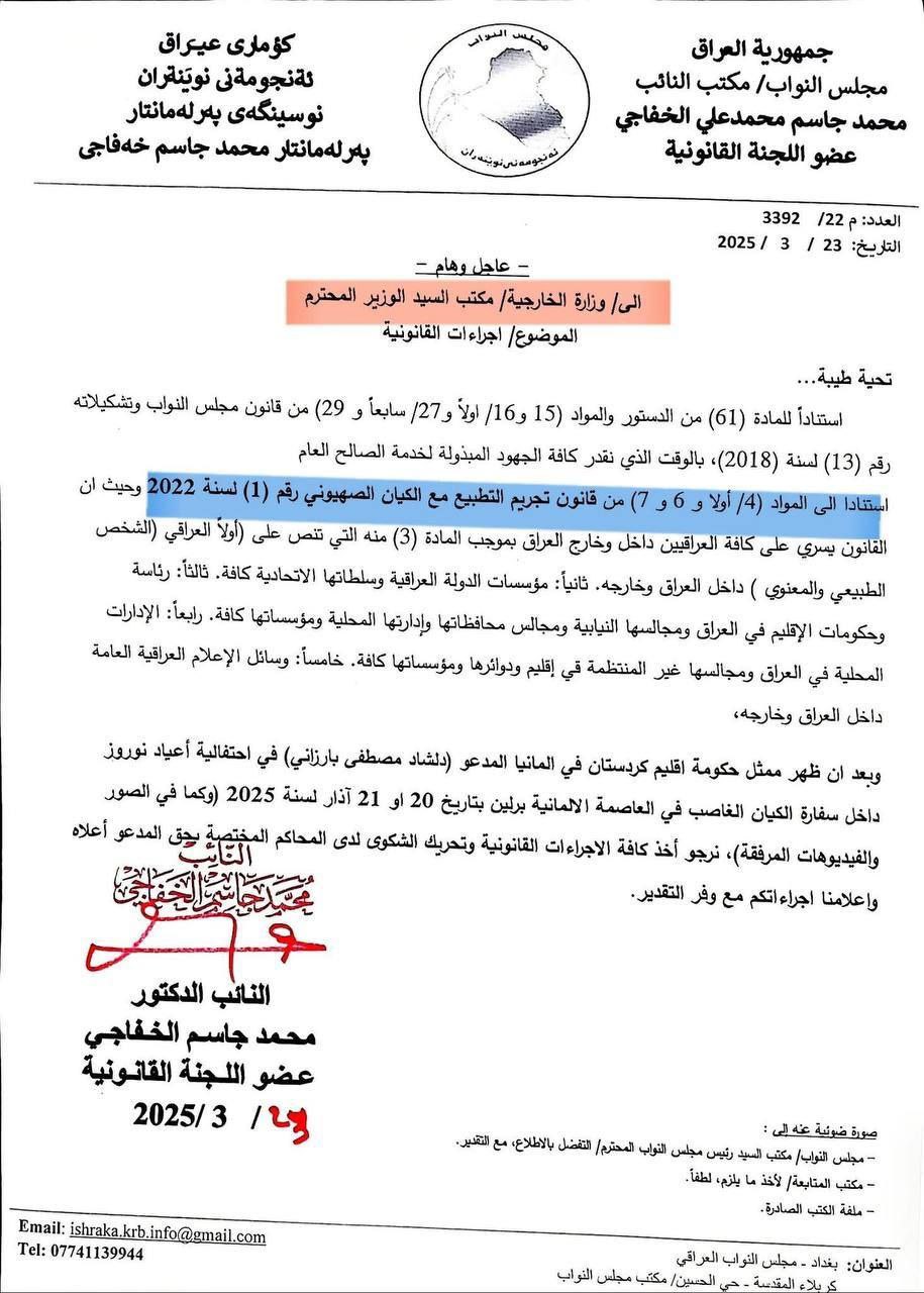 هەروەها هەر دوێکە دکتۆر محمد خەفاجی ئەندامی لیژنەی یاسای پەرلەمانی عێراق نووسراوی ئاراستەی داواکاری گشتی کردووە بۆ جوڵاندنی سکاڵا لە سەر هەمان دۆسییە، هەمان پەرلەمانتار داوای لە فوئاد حوسێن وەزیری دەرەوە کردووە رێوشوێن بگرێتەبەرو لە دادگای تایبەتمەند سکاڵا تۆماربکات.