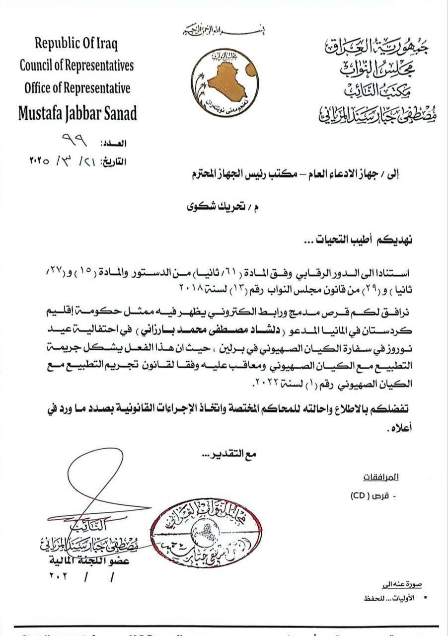 لە رێککەوتی 21ـی ئاداری 2025 دوای ئەوەی دڵشاد بارزانی برای مەسعود بارزانی سەرۆکی پارتی دیمۆکراتی کوردستان و نوێنەری حکومەتی هەرێمی کوردستان لە ئەڵمانیا لە ئاهەنگی نەورۆز کە لە لایەن باڵیۆزخانەی ئیسـرائیل رێکخراو بوو بەشداربوو لە بەغداد سکاڵا لە سەر دڵشاد بارزانی تۆمار کرا.
