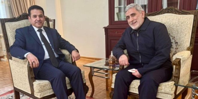 قاسم ئەعرەجی، راوێژکارى ئاسایشی نیشتمانیی عێراق و ئیسماعیل قائانی، فەرماندەی فەیلەقی قودس لە بەغداد کۆبوونەوە و گفتوگۆیان لەبارەى رێککەوتنی ئەمنیی تاران و بەغداد و دانوستانەکانی ئێران و ئەمریکا کرد.