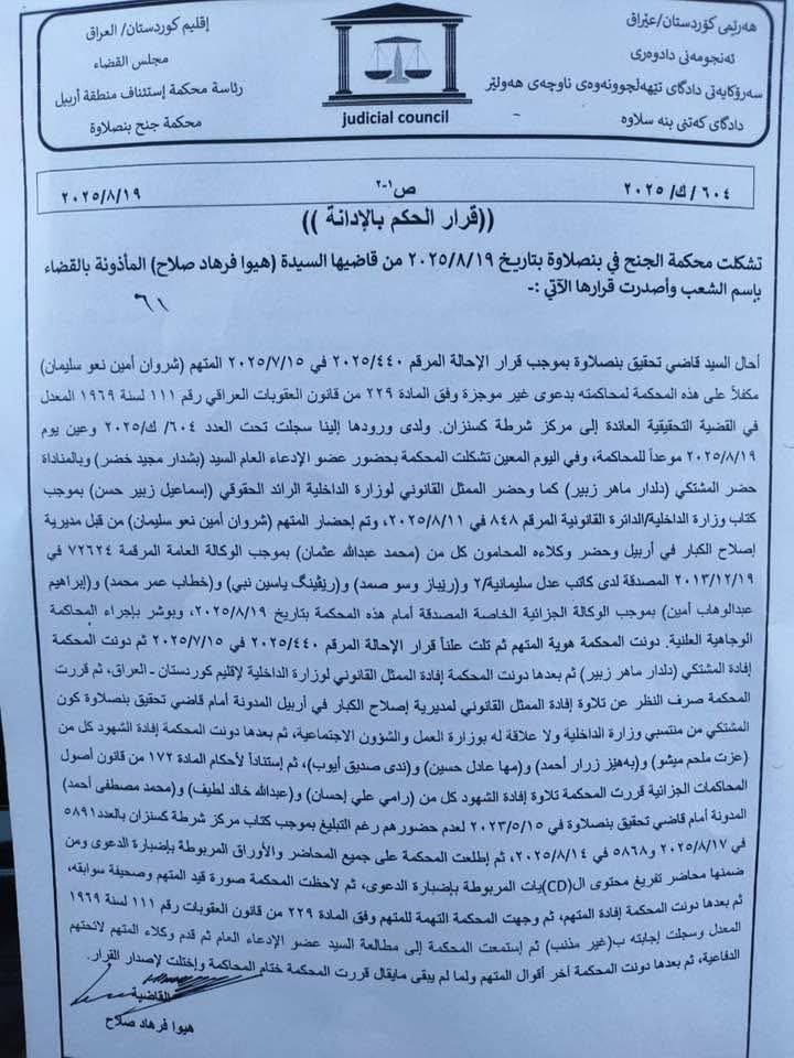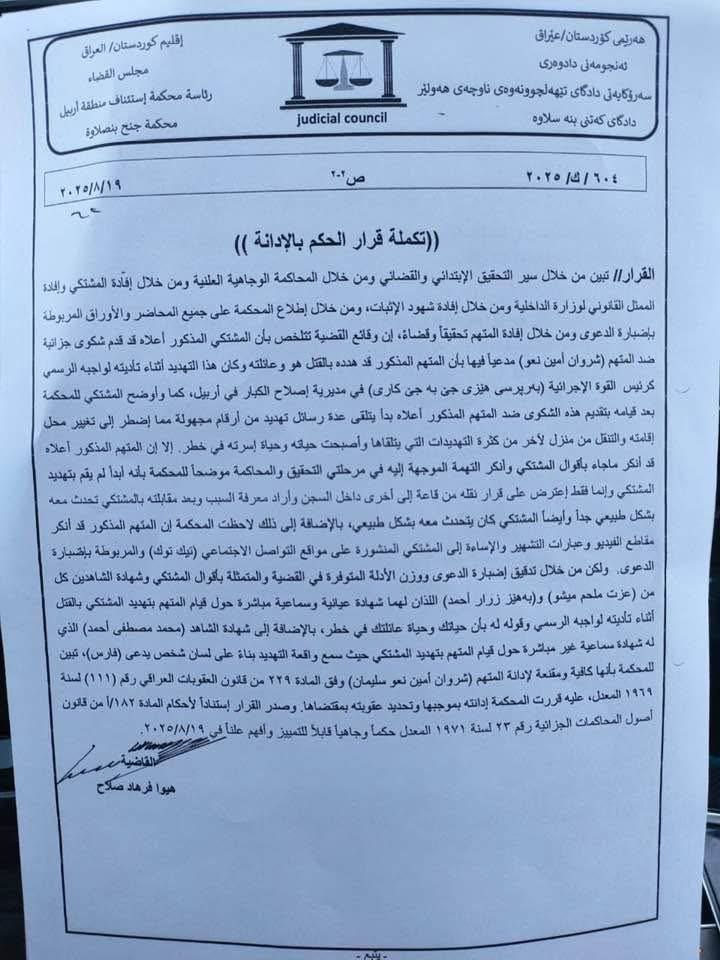 قەندیل پرێس وێنەیەک لە بریاری سزادانی رۆژنامەنوس شێروان شێروانی بڵاودەکاتەوە
